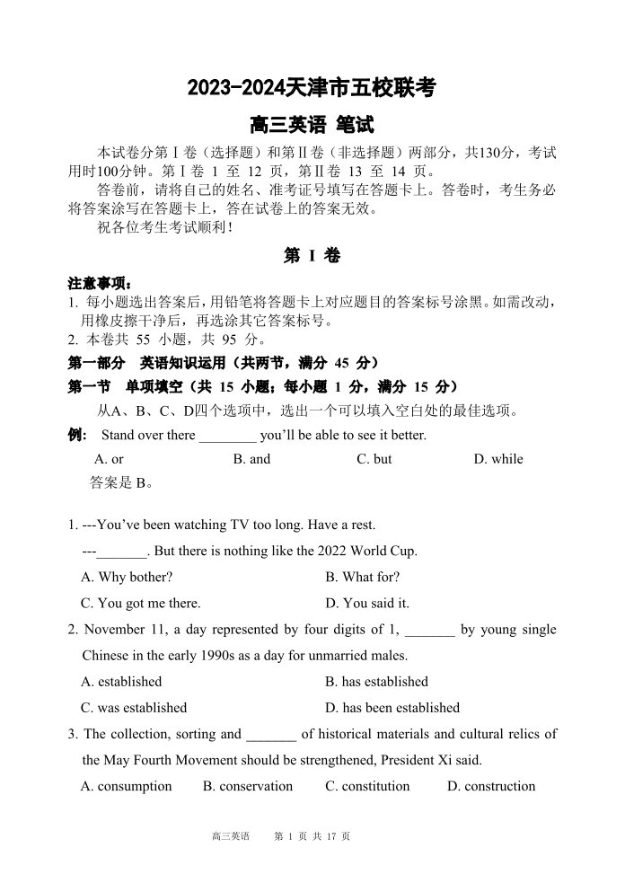天津市五所重点高中2024届高三上学期12月联考英语