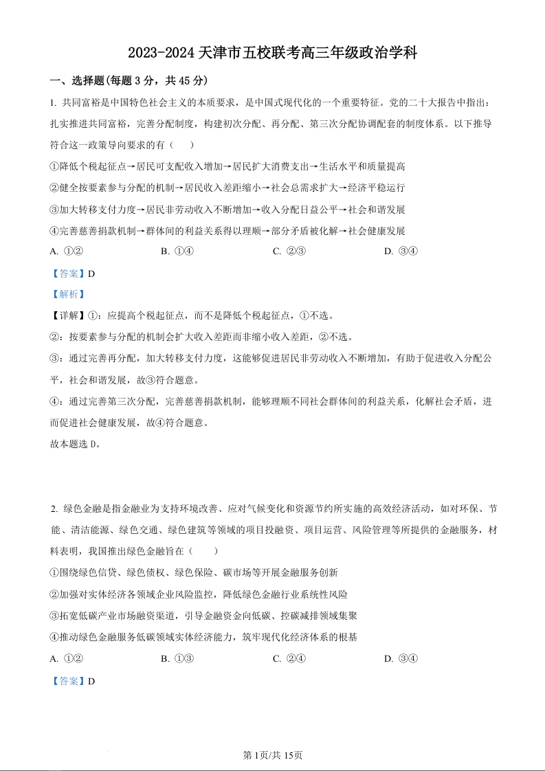 天津市五所重点高中2024届高三上学期12月联考政治(精品解析版)
