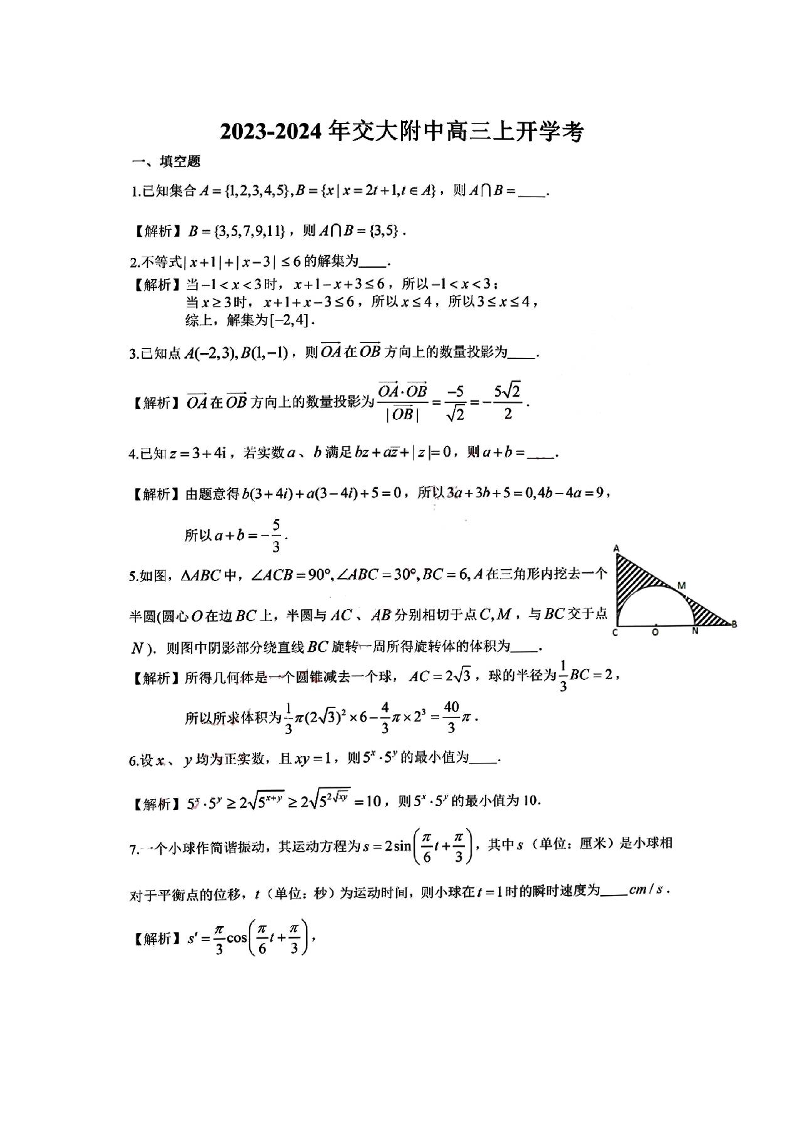 上海市上海交通大学附属中学2024届高三上学期摸底考试数学答案