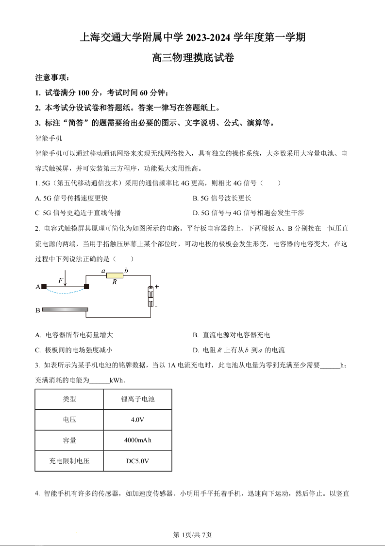 上海市上海交通大学附属中学2024届高三上学期摸底考试物理(原卷版)