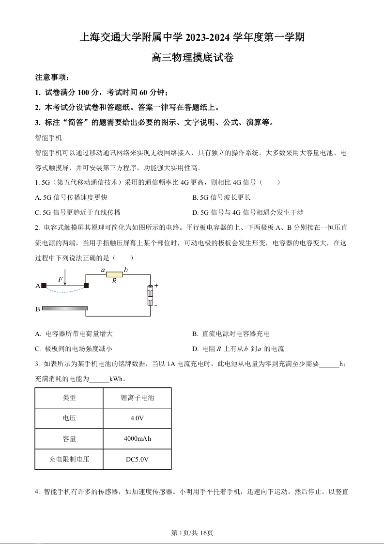 上海市上海交通大学附属中学2024届高三上学期摸底考试物理(精品解析版)