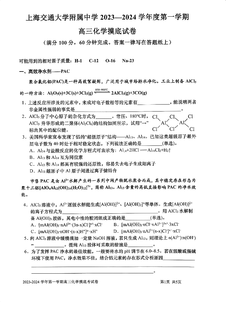 上海市上海交通大学附属中学2024届高三上学期摸底考试化学