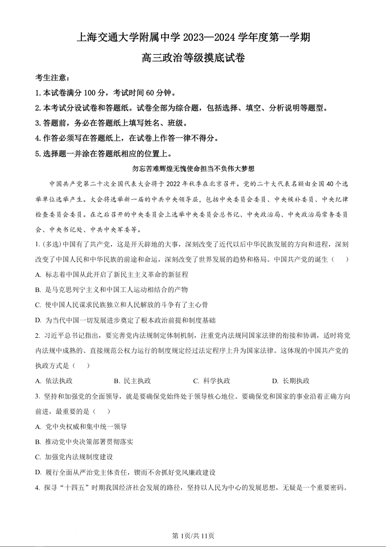 上海市上海交通大学附属中学2024届高三上学期摸底考试政治(精品解析版)