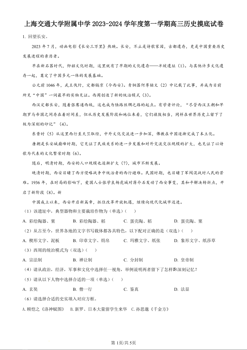 上海市上海交通大学附属中学2024届高三上学期摸底考试历史(原卷版)