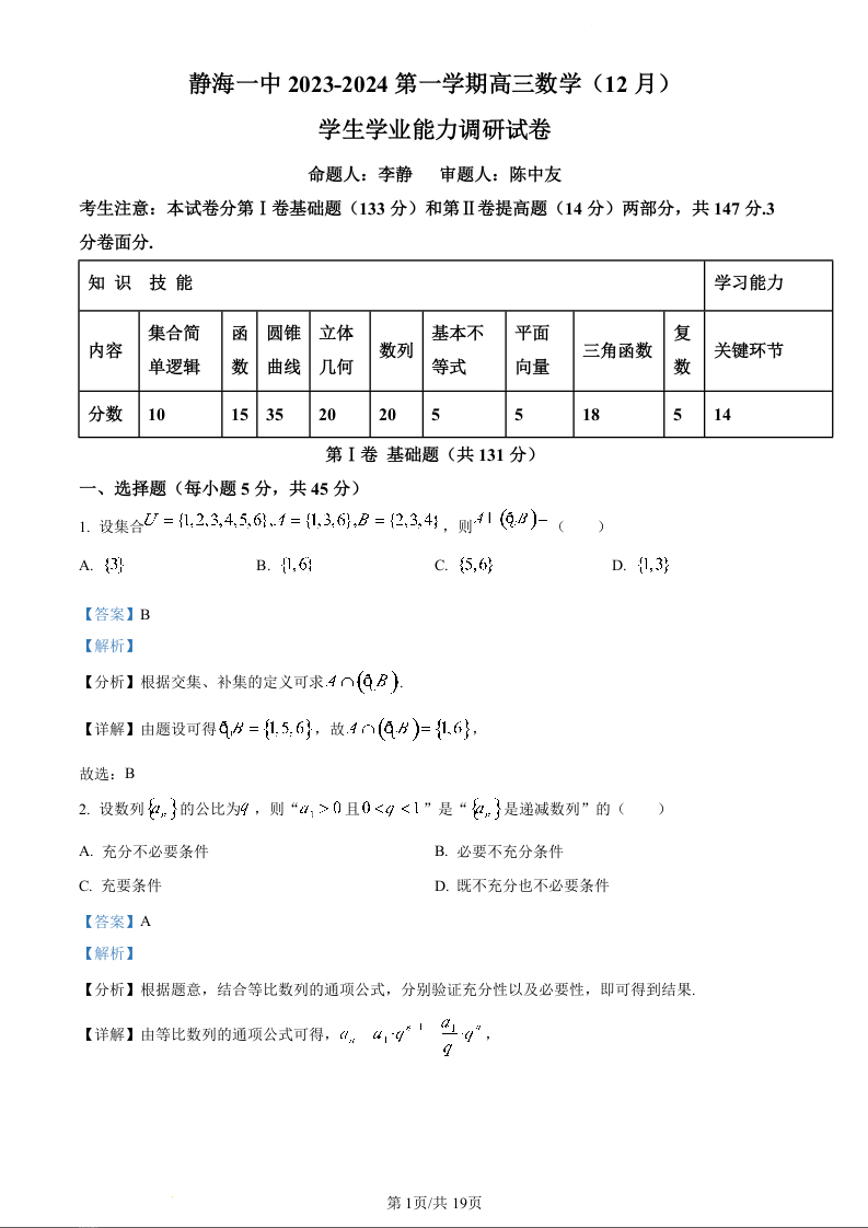 天津市静海区第一中学2024届高三上学期12月月考数学(精品解析版)