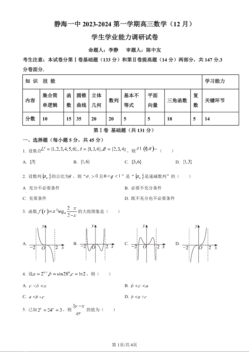 天津市静海区第一中学2024届高三上学期12月月考数学(原卷版)