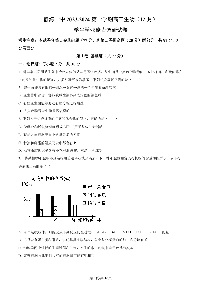 天津市静海区第一中学2024届高三上学期12月月考生物(原卷版)