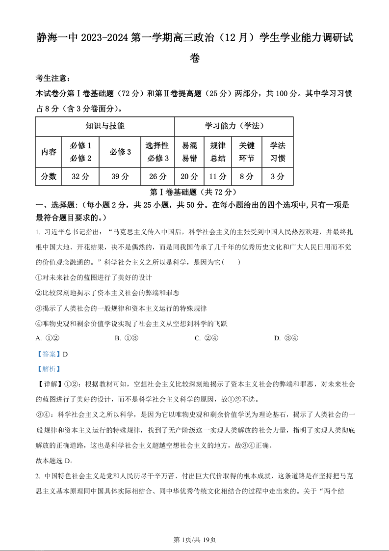天津市静海区第一中学2024届高三上学期12月月考政治(精品解析版)