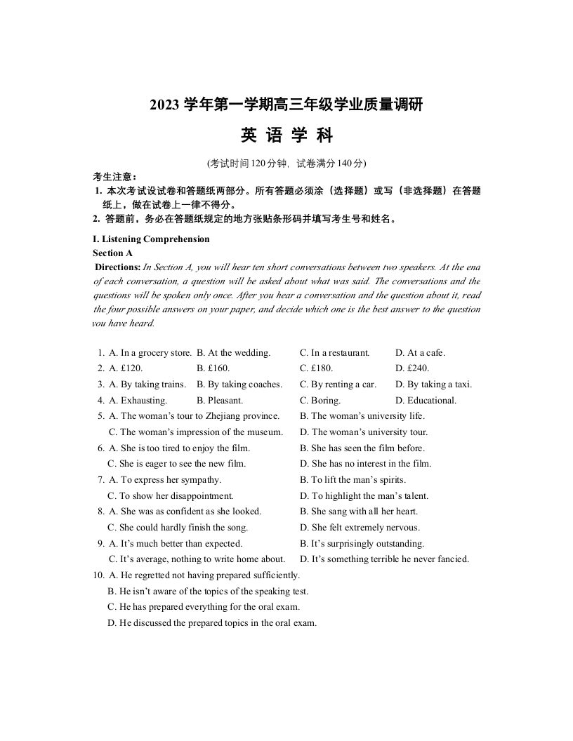 上海市闵行区2024届高三上学期学业质量调研试题(一模)英语+答案