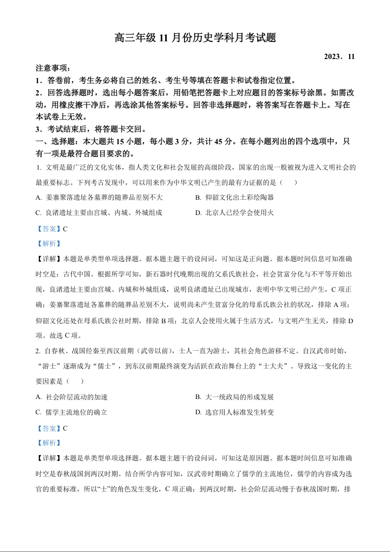 山东省五莲县第一中学2024届高三上学期11月月考历史(精品解析版)