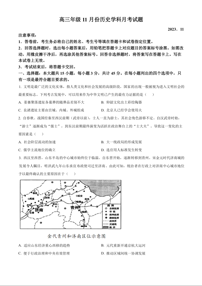 山东省五莲县第一中学2024届高三上学期11月月考历史(原卷版)