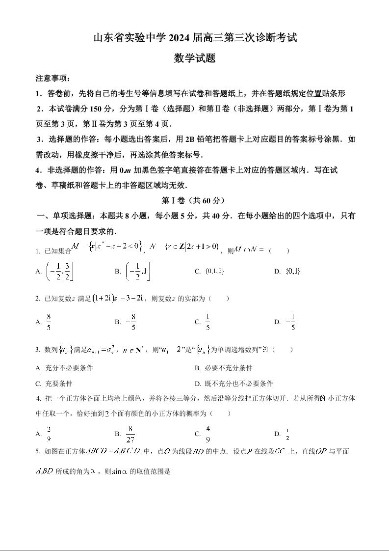 山东省实验中学2024届高三上学期第三次诊断考试(12月)数学+答案