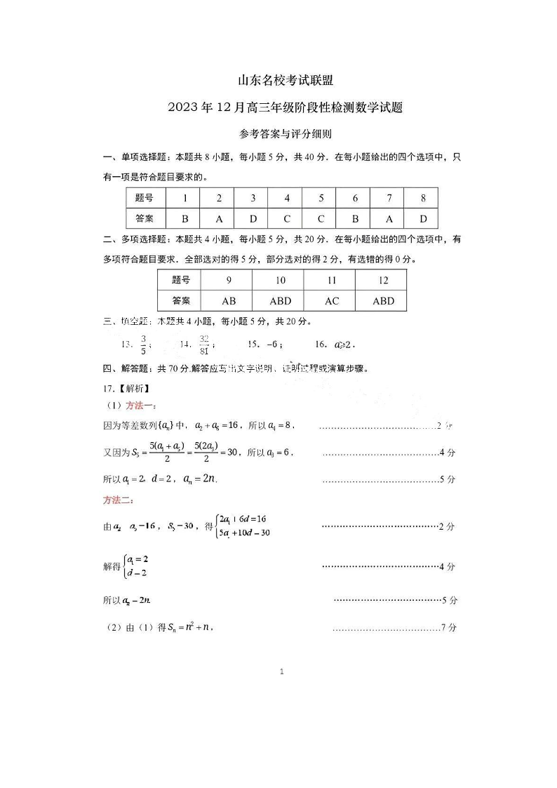 山东省名校联盟2024届高三上学期12月阶段性测试数学答案
