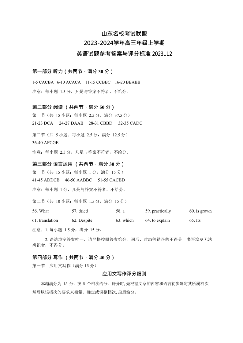 山东省名校联盟2024届高三上学期12月阶段性测试英语答案