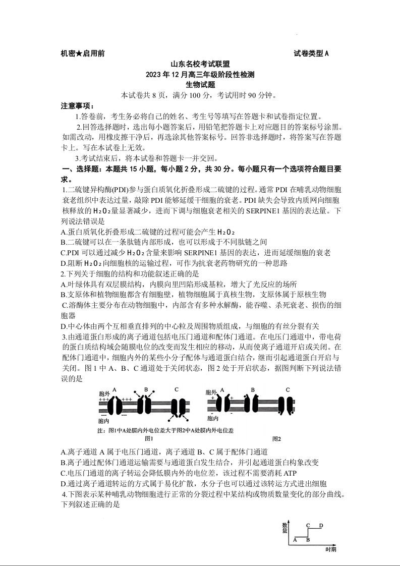 山东省名校联盟2024届高三上学期12月阶段性测试生物+答案