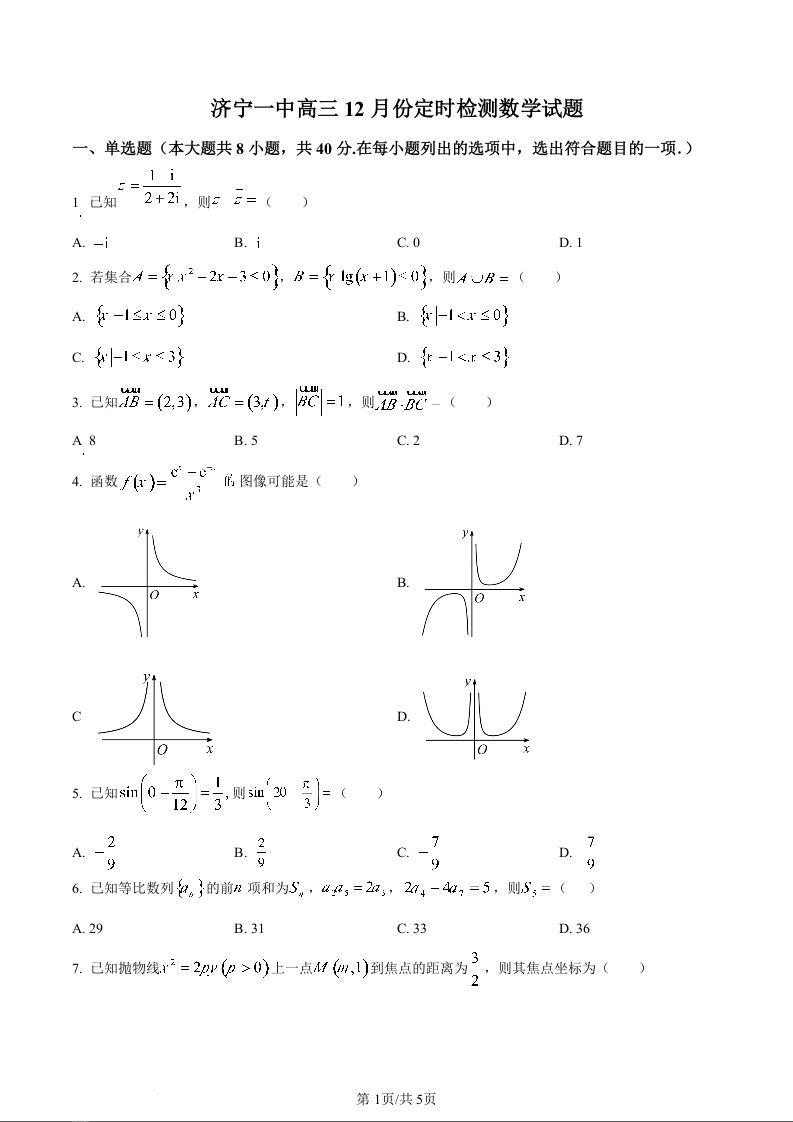 山东省济宁市第一中学2024届高三上学期12月月考数学(原卷版)