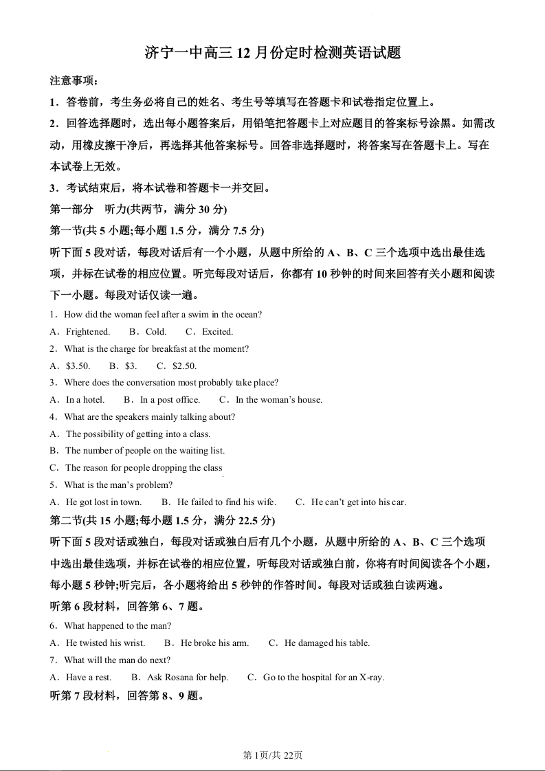 山东省济宁市第一中学2024届高三上学期12月月考英语(精品解析版)