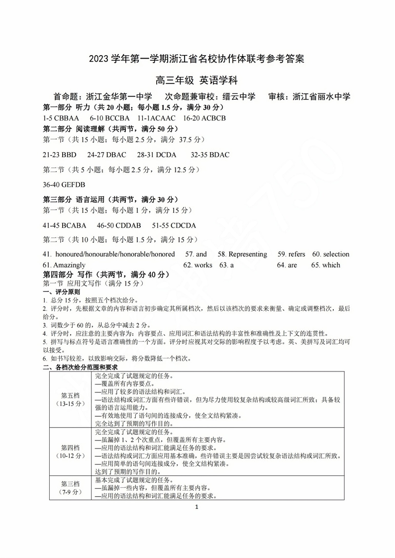 浙江省名校协作体2024届高三上学期返校联考英语答案