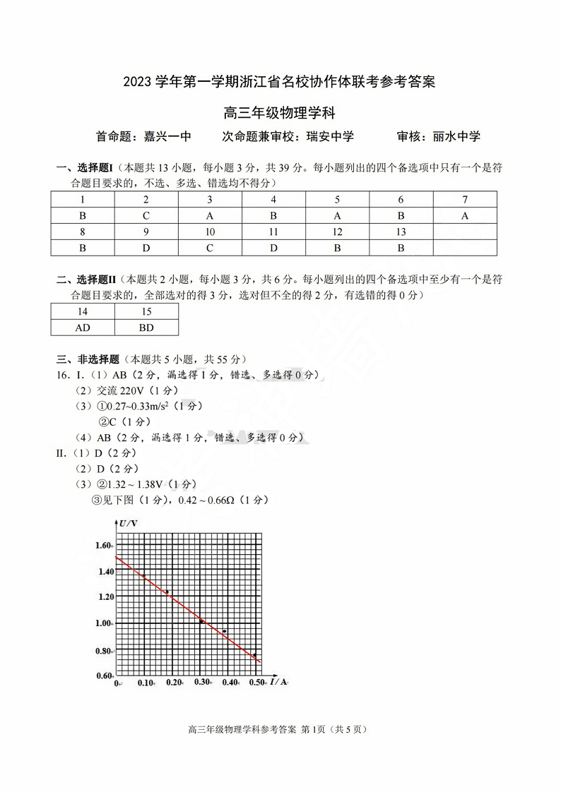 浙江省名校协作体2024届高三上学期返校联考物理答案