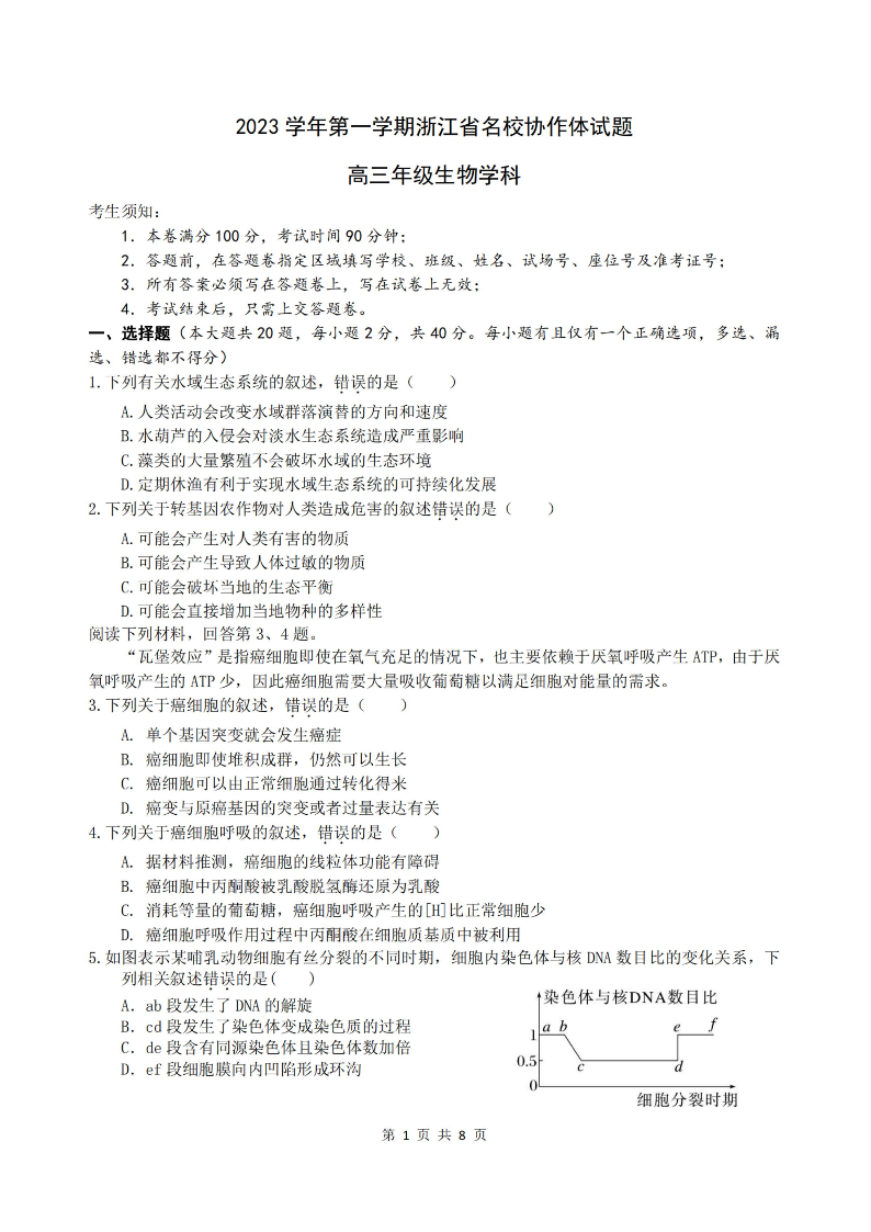 浙江省名校协作体2024届高三上学期返校联考生物