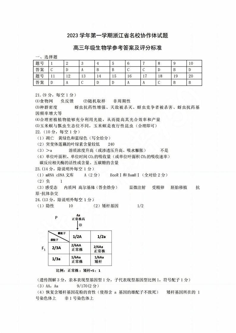 浙江省名校协作体2024届高三上学期返校联考生物答案