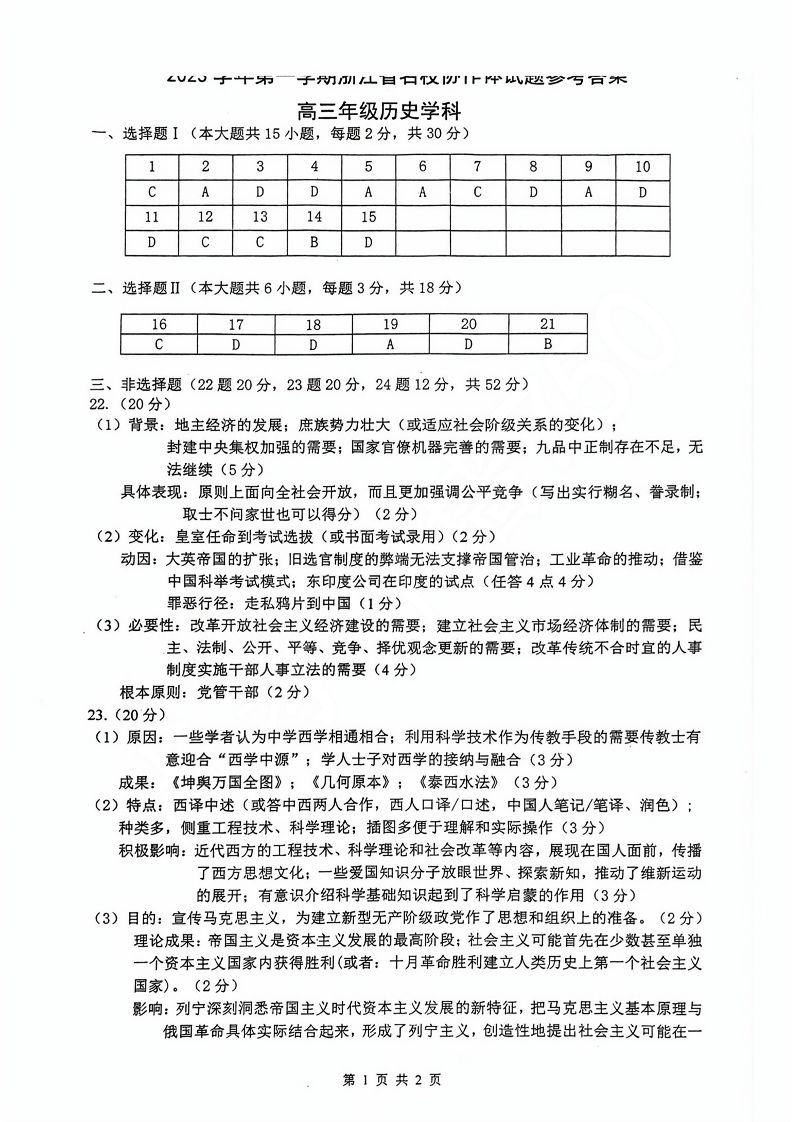 浙江省名校协作体2024届高三上学期返校联考历史答案