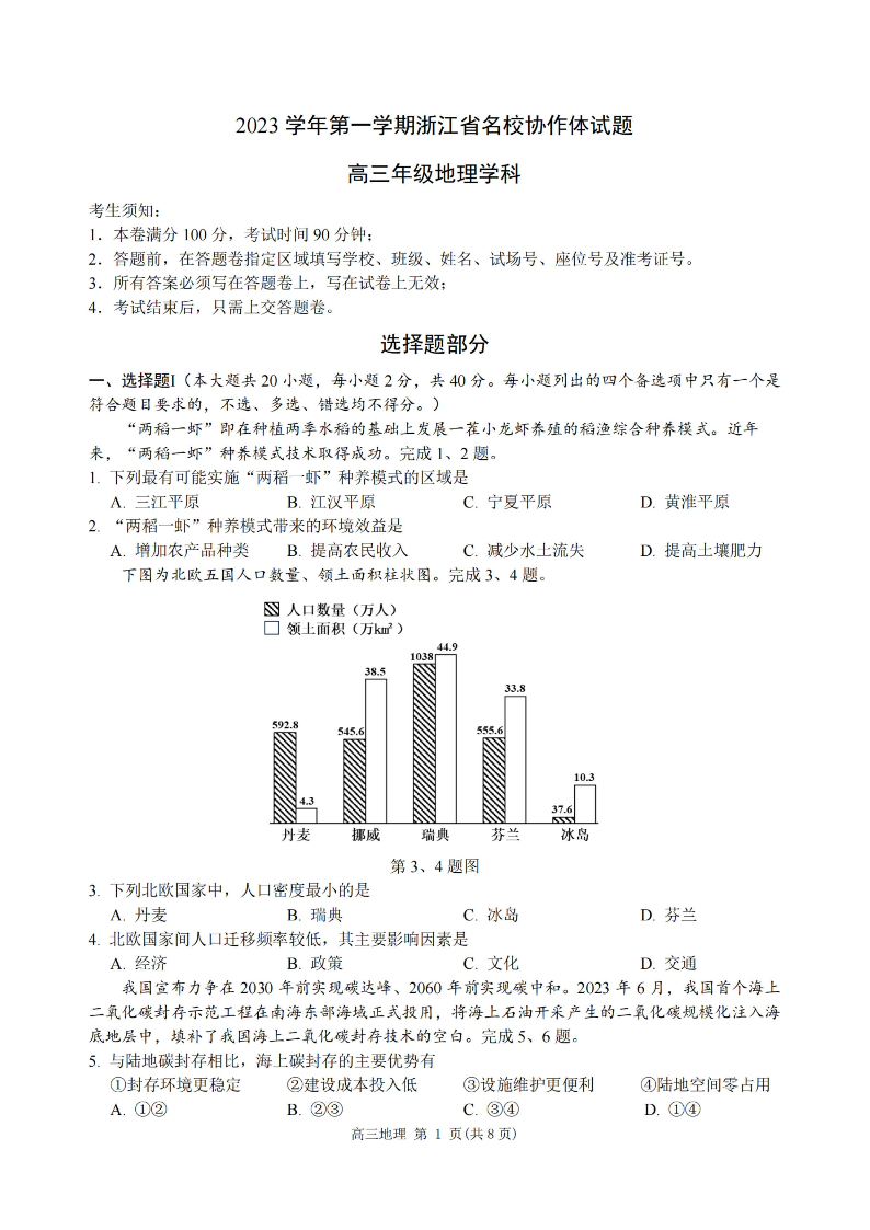 浙江省名校协作体2024届高三上学期返校联考地理