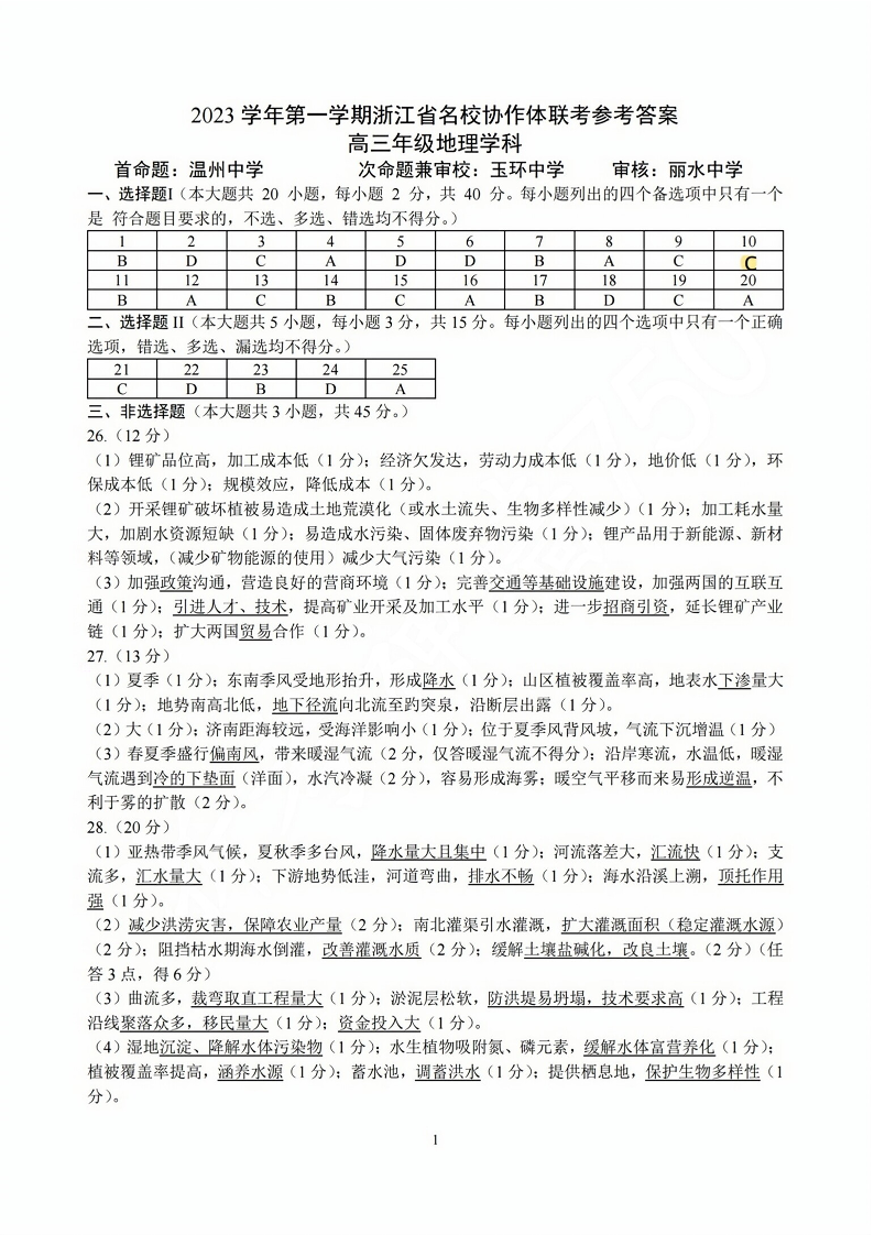 浙江省名校协作体2024届高三上学期返校联考地理答案