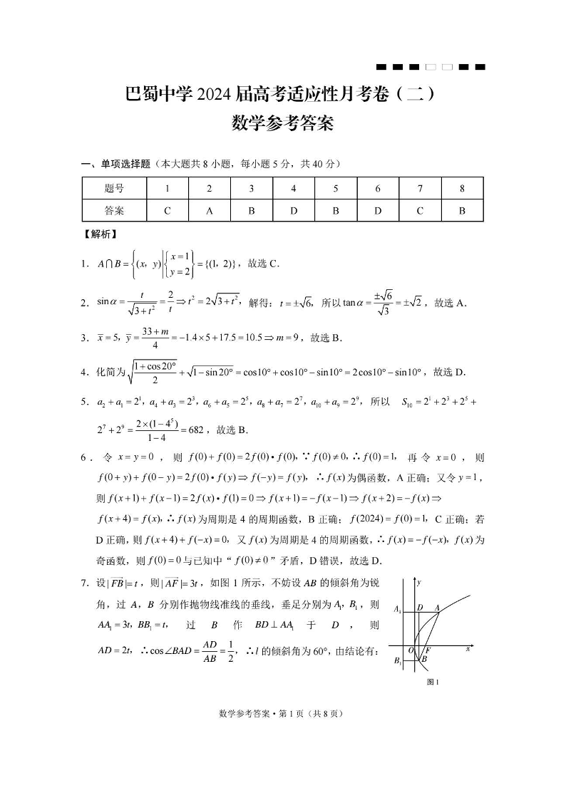 重庆市巴蜀中学2024届高考适应性月考(二)数学答案