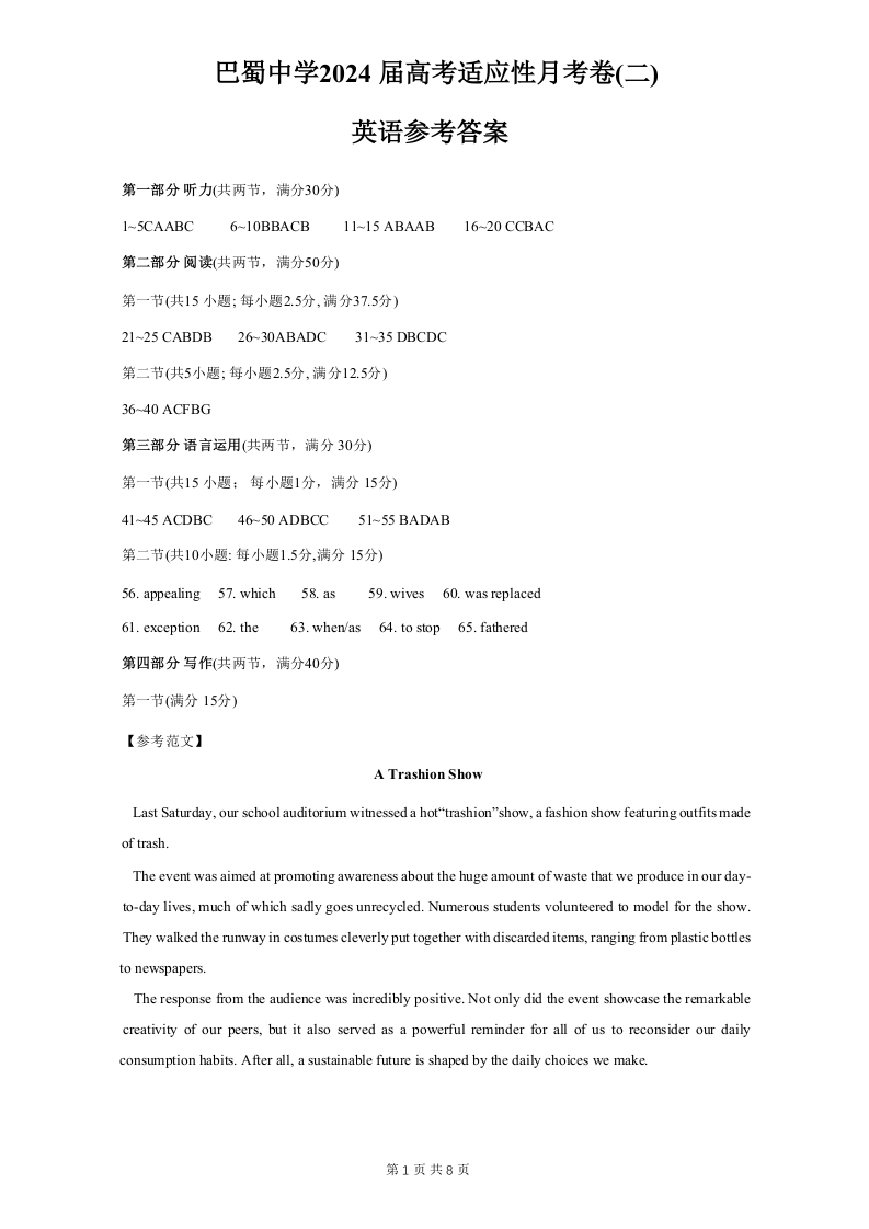 重庆市巴蜀中学2024届高考适应性月考(二)英语答案