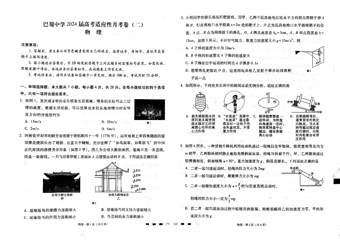 重庆市巴蜀中学2024届高考适应性月考(二)物理