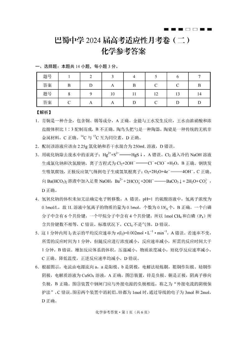 重庆市巴蜀中学2024届高考适应性月考(二)化学答案