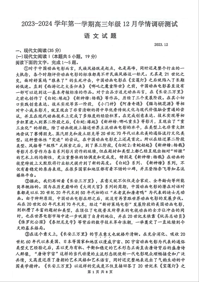 江苏省扬州市高邮市2024届高三上学期12月月考语文+答案