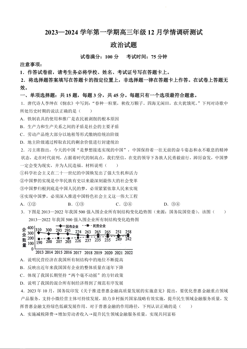 江苏省扬州市高邮市2024届高三上学期12月月考政治+答案