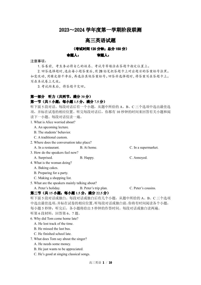 江苏省五市十一校2024届高三上学期12月阶段联测英语