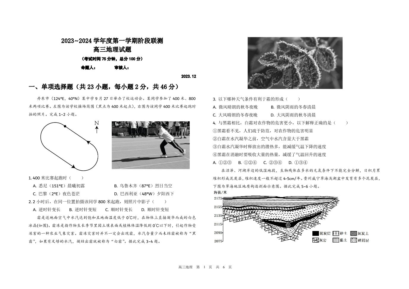 江苏省五市十一校2024届高三上学期12月阶段联测地理