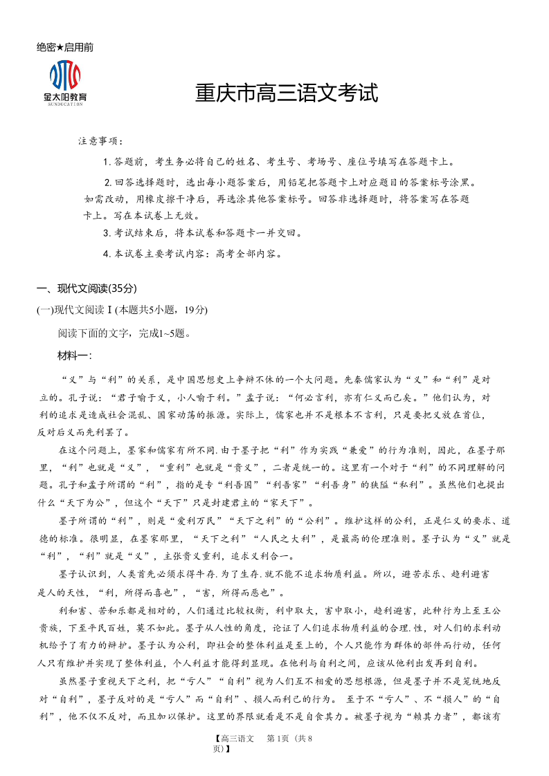 重庆好教育联盟2024届高三金太阳9月开学联考语文