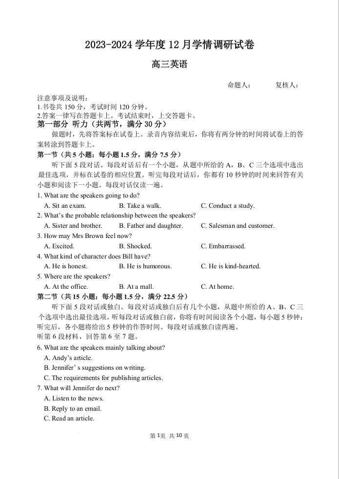 江苏省无锡市四校2024届高三上学期12月学情调研试卷英语