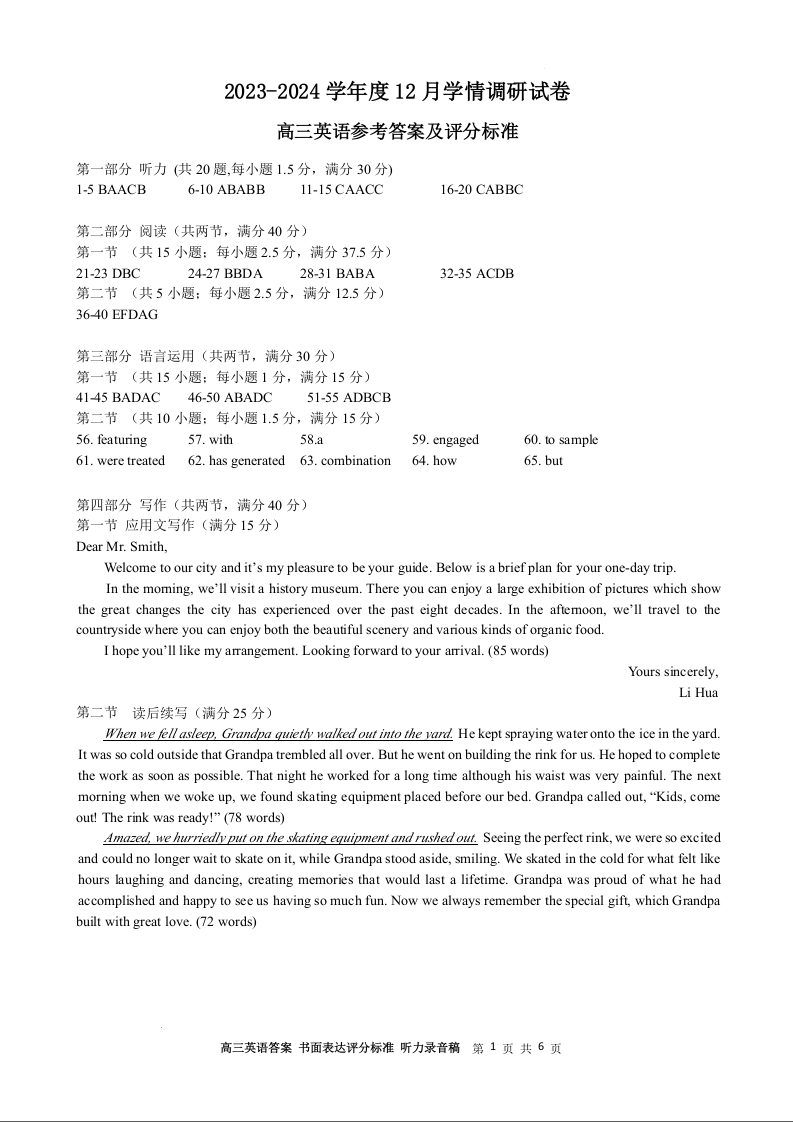 江苏省无锡市四校2024届高三上学期12月学情调研试卷英语答案