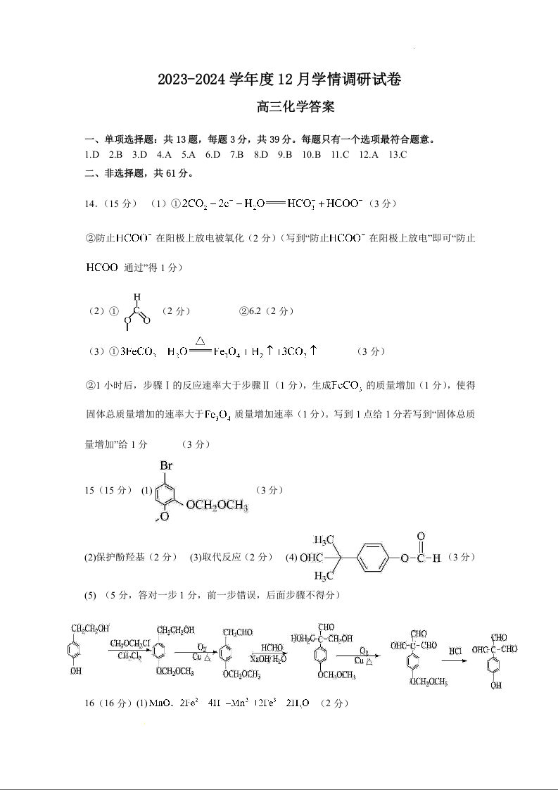 江苏省无锡市四校2024届高三上学期12月学情调研试卷化学答案