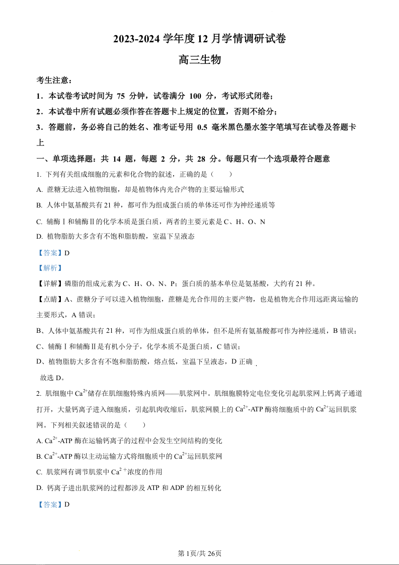 江苏省无锡市四校2024届高三上学期12月学情调研试卷生物(精品解析版)