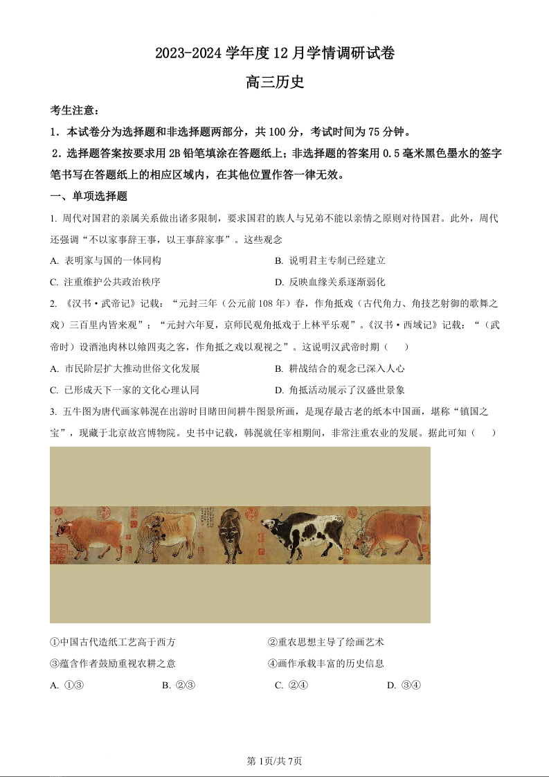江苏省无锡市四校2024届高三上学期12月学情调研试卷历史(原卷版)