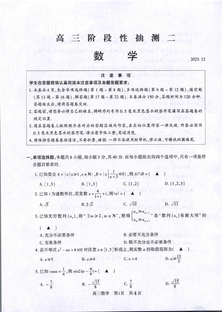 江苏省常熟市2024届高三上学期阶段性抽测二数学+答案