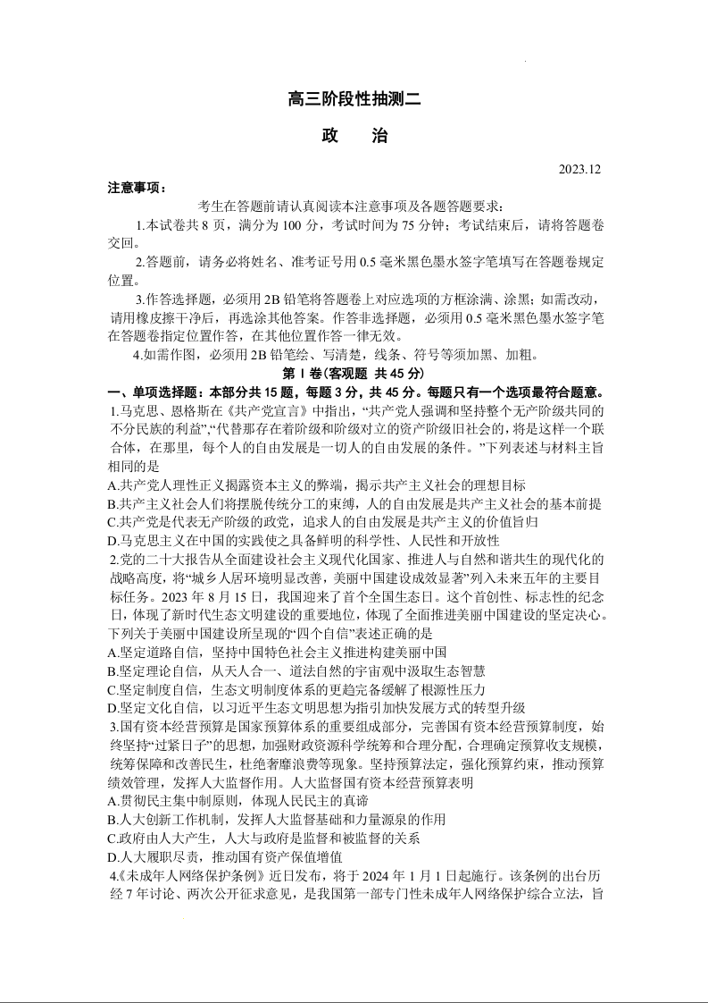 江苏省常熟市2024届高三上学期阶段性抽测二政治+答案