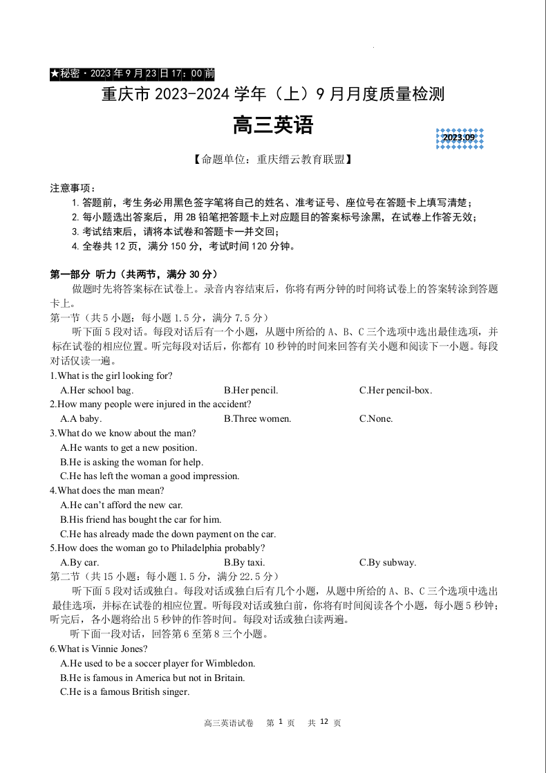 重庆市缙云联盟2024届高三上学期9月联考英语