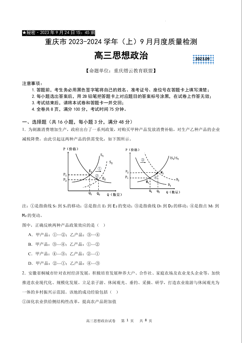重庆市缙云联盟2024届高三上学期9月联考政治