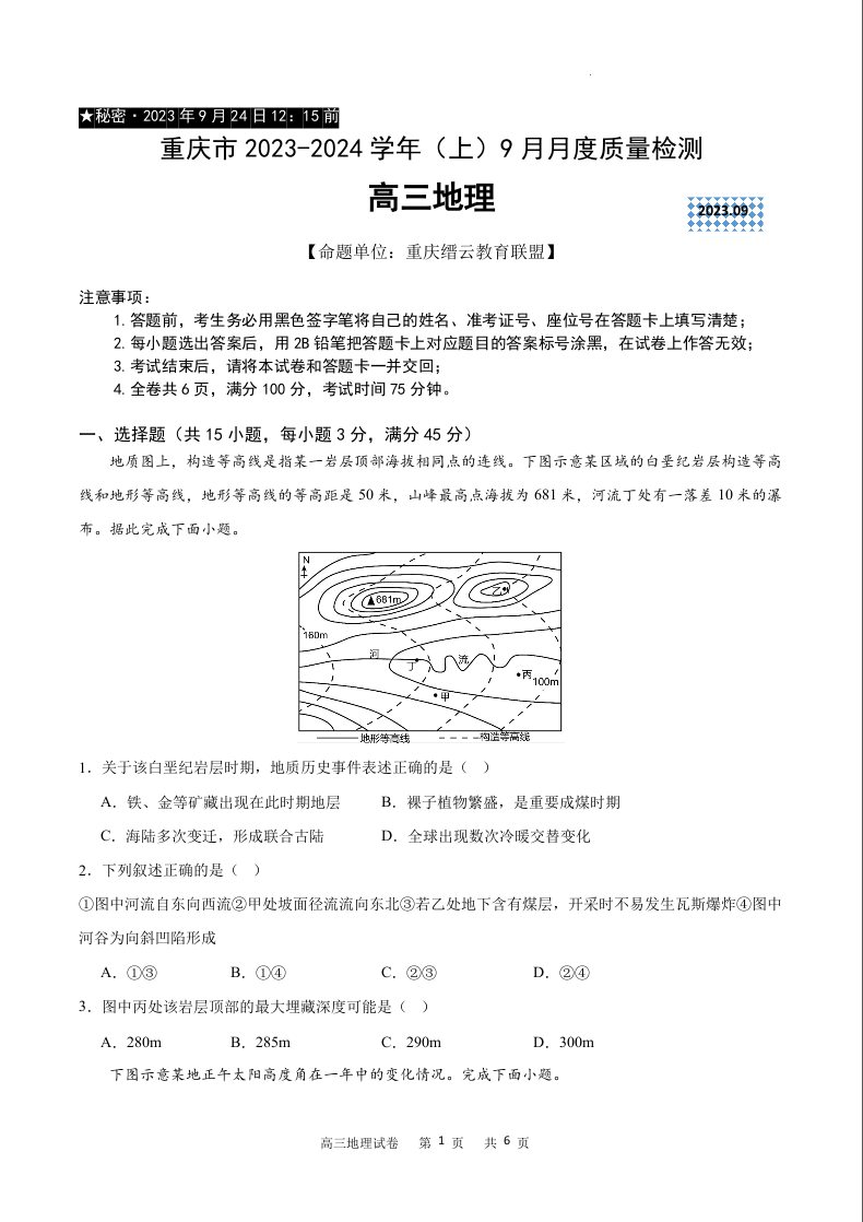 重庆市缙云联盟2024届高三上学期9月联考地理
