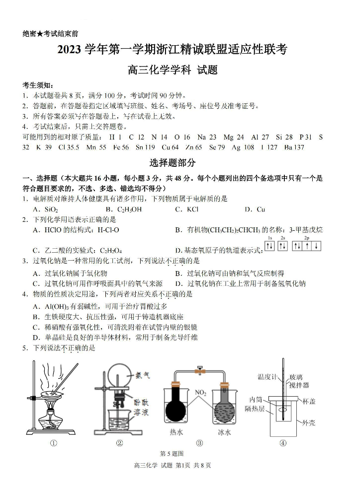 浙江省精诚联盟2024届高三上学期12月适应性联考化学