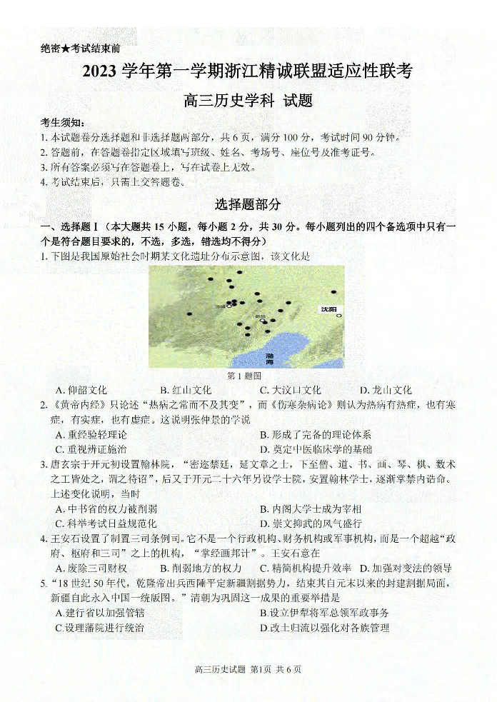 浙江省精诚联盟2024届高三上学期12月适应性联考历史