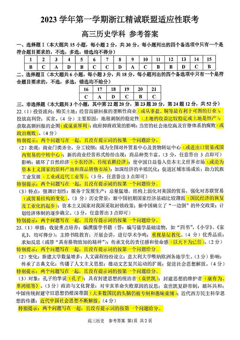 浙江省精诚联盟2024届高三上学期12月适应性联考历史答案